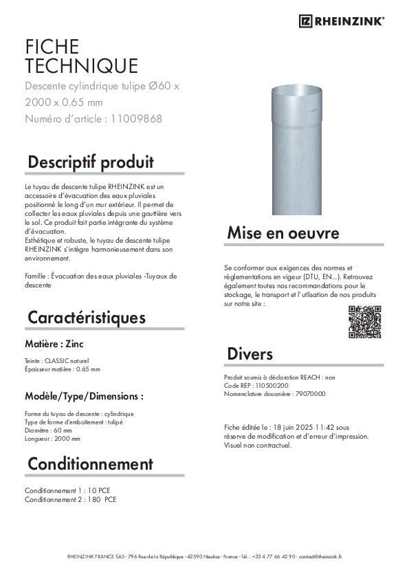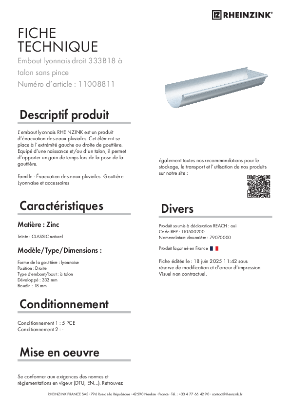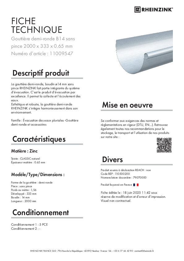 Rechercher sur notre site Type de résultat Général (93) Actualités (20) informations d'identification (14) Télécharger (183) chercher Search words under length of 4 characters are not processed. previous1011121314next Embout lyonnais droit 333B18 à talon réf. 11008811 … pour l'évacuation des eaux pluviales en zinc pdf 137 Ko Embout lyonnais droit 250B18 à talon réf. 11008812 … pour l'évacuation des eaux pluviales en zinc pdf 138 Ko Accessoires pour toit en tuiles …Accessoires en zinc pour la couverture en tuiles Profilés et accessoires en zinc pour couverture tuile … CLASSIC …EINZINK-CLASSIC naturel – l'expression originelle ZINC-TITANE NATUREL. SE PATINE AU FIL DES ANS. … Cuvette Jambon Ø100 mm réf. 11008137 … pour l'évacuation des eaux pluviales en zinc pdf 163 Ko Gouttière demi-ronde B14 sans pince réf. 11009547 … pour l'évacuation des eaux pluviales en zinc pdf 163 Ko Cuvette Jambon Ø80 mm réf. 11008131 … pour l'évacuation des eaux pluviales en zinc pdf 163 Ko Descente cylindrique tulipe réf. 11009868 … pour l'évacuation des eaux pluviales en zinc pdf 109 Ko Element de dilatation pour gouttière réf. 11008707 … dilatation RHEINZINK 11008707 pour gouttière en zinc pdf 139 Ko Element de dilatation pour gouttière réf. 11008708 … dilatation RHEINZINK 11008708 pour gouttière en zinc pdf 139 Ko previous1011121314next