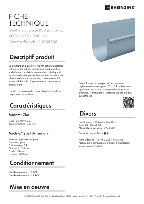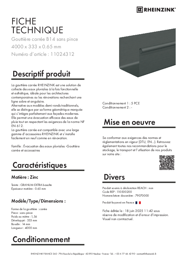 Rechercher sur notre site Type de résultat Général (93) Actualités (20) informations d'identification (14) Télécharger (183) chercher Search words under length of 4 characters are not processed. previous1112131415next Études chantier … 1 : quantification de vos besoins en zinc À partir de vos plans, nous calculons pour vous la… Produits durables … quand même aller plus loin. Pourquoi le zinc est-il durable ? Si vous souhaitez en apprendre un… Qui sommes-nous ? …RHEINZINK est synonyme de zinc-titane de qualité. Depuis sa création en 1966, RHEINZINK est l’un des leaders… Lignes de produits … dès la sortie d'usine. prePATINA ECO ZINC Des couleurs semi-transparentes inspirées de la nature … Podcasts …Le zinc, un matériau éco-responsable : construire pour l'avenir Plongez dans l'univers fascinant du zinc en… Gouttière anglaise B30 sans pince réf. 11009803 … pour l'évacuation des eaux pluviales en zinc pdf 181 Ko Gouttière anglaise B30 sans pince réf. 11009806 … pour l'évacuation des eaux pluviales en zinc pdf 180 Ko Equerre lyonnaise intérieure emboutie réf. 11007592 … pour l'évacuation des eaux pluviales en zinc pdf 152 Ko Longévité … plus en phase avec ces valeurs de base que le zinc ? Beaucoup de choses changent en 50, 100 ou… Gouttière carrée B14 sans pince réf. 11024312 …Fiche technique de la gouttière carrée en zinc RHEINZINK-GRANUM EXTRA basalte 11024312 pour l'évacuation des eaux… pdf 162 Ko previous1112131415next