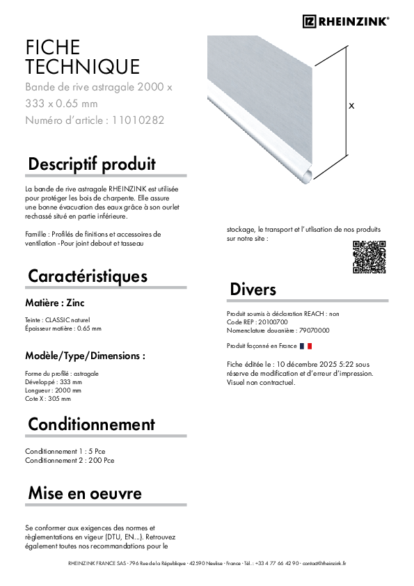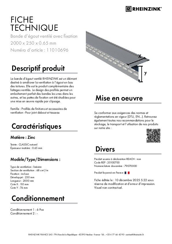 Rechercher sur notre site Type de résultat Général (16) Actualités (3) Télécharger (124) chercher previous1112131415next Bande de rive astragale 2000 x 166 x 0.65 mm - réf. 11010267 Fiche technique de la bande de rive astragale 2000 x 166 x 0.65 mm en zinc CLASSIC naturel - réf. 11010267 pdf 121 Ko Bande de rive astragale 2000 x 200 x 0.65 mm - réf. 11010272 Fiche technique de la bande de rive astragale 2000 x 200 x 0.65 mm en zinc CLASSIC naturel - réf. 11010272 pdf 121 Ko Bande de rive astragale 2000 x 250 x 0.65 mm - réf. 11010277 Fiche technique de la bande de rive astragale 2000 x 250 x 0.65 mm en zinc CLASSIC naturel - réf. 11010277 pdf 121 Ko Bande de rive astragale 2000 x 333 x 0.65 mm - réf. 11010282 Fiche technique de la bande de rive astragale 2000 x 333 x 0.65 mm en zinc CLASSIC naturel - réf. 11010282 pdf 121 Ko Bande de battellement 2000 x 200 x 0.65 mm - réf. 11010291 Fiche technique de la bande de battellement 2000 x 200 x 0.65 mm en zinc RHEINZINK - réf. 11010291 pdf 120 Ko Bande à rabattre 2000 x 66 x 0.65 mm - réf. 11010329 Fiche technique de la bande à rabattre 2000 x 66 x 0.65 mm en zinc CLASSIC naturel - réf. 11010329 pdf 120 Ko Bande de solin à biseau 2000 x 100 x 0.65 mm - réf. 11010349 Fiche technique de la bande de solin à biseau 2000 x 100 x 0.65 mm en zinc CLASSIC naturel - réf. 11010349 pdf 121 Ko Bande de solin joint mastic 2000 x 100 x 0.65 mm - réf. 11010355 Fiche technique de la bande de solin joint mastic 2000 x 100 x 0.65 mm en zinc CLASSIC naturel - réf. 11010355 pdf 122 Ko Bande d'égout ventilé avec fixation 2000 x 250 x 0.65 mm - réf. 11010696 …Fiche technique de la bande d'égout ventilé avec fixation 2000 x 250 x 0.65 mm en zinc CLASSIC naturel - réf.… pdf 122 Ko Bande d'égout non ventilé avec fixation 2000 x 250 x 0.65 mm - réf. 11010721 …Fiche technique de la bande d'égout non ventilé avec fixation 2000 x 250 x 0.65 mm en zinc CLASSIC naturel - réf.… pdf 140 Ko previous1112131415next