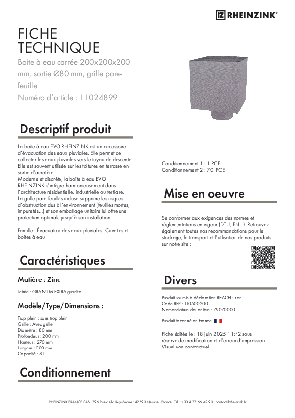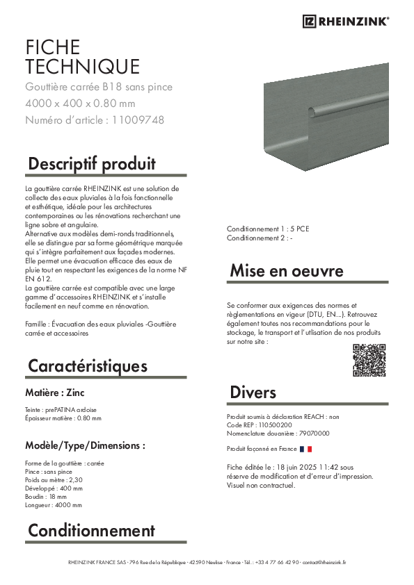 Rechercher sur notre site Type de résultat Général (93) Actualités (20) informations d'identification (14) Télécharger (183) chercher Search words under length of 4 characters are not processed. previous1415161718next Gouttière carrée B18 sans pince réf. 11009744 … pour l'évacuation des eaux pluviales en zinc pdf 179 Ko Gouttière carrée B18 sans pince réf. 11009747 … pour l'évacuation des eaux pluviales en zinc pdf 174 Ko Système de ventilation linéaire …Faîtages et bandes d'égout ventilés pour couverture en zinc pdf 568 Ko Gouttière carrée B18 sans pince réf. 11009748 … pour l'évacuation des eaux pluviales en zinc pdf 178 Ko Dauphin carré droit rouge réf. 11009307 … pour l'évacuation des eaux pluviales en zinc pdf 67 Ko RHEINZINK-CLASSIC Material data sheet pdf 401 Ko Boite à eau carrée 200x200x200 mm réf. 11024899 …Fiche technique de la boîte à eau carrée en zinc RHEINZINK-GRANUM EXTRA granite 11024899pour l'évacuation des eaux… pdf 160 Ko Gouttière demi-ronde B14 sans pince réf. 11009546 … pour l'évacuation des eaux pluviales en zinc pdf 162 Ko RHEINZINK-prePATINA graphite grey Material data sheet pdf 500 Ko Développement durable …Construction durable avec RHEINZINK Le zinc RHEINZINK se compose de zinc électrolytique très pur, auquel… previous1415161718next