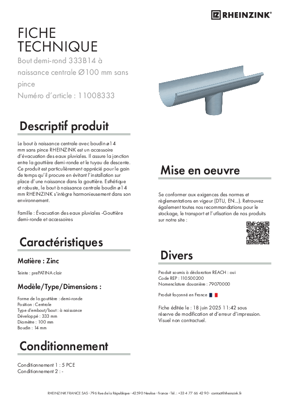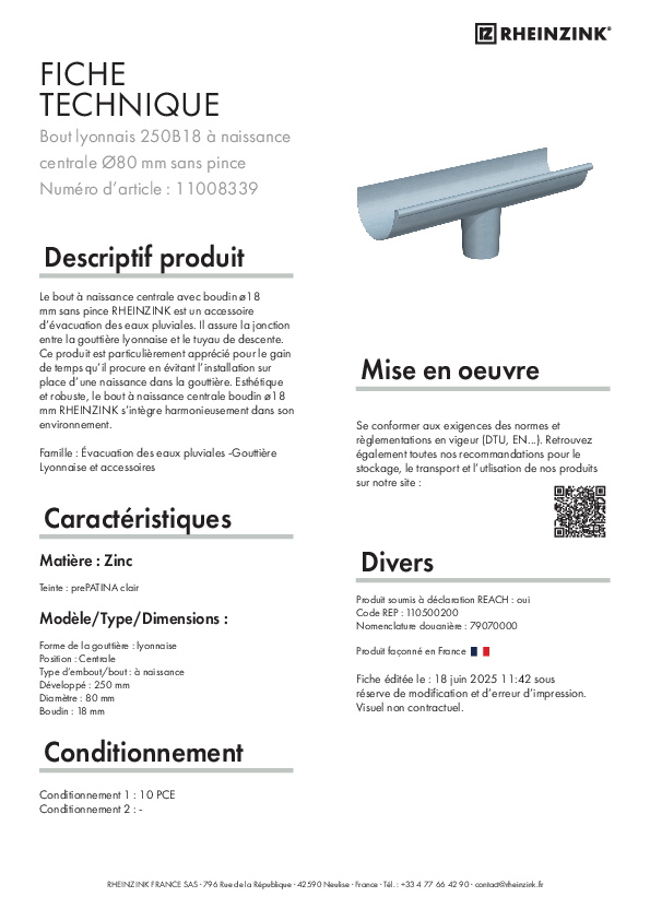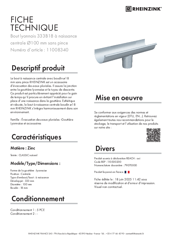 Fiche technique de l'équerre lyonnaise intérieure emboutie en zinc RHEINZINK-CLASSIC naturel 11007613 pour l'évacuation des eaux pluviales en zinc