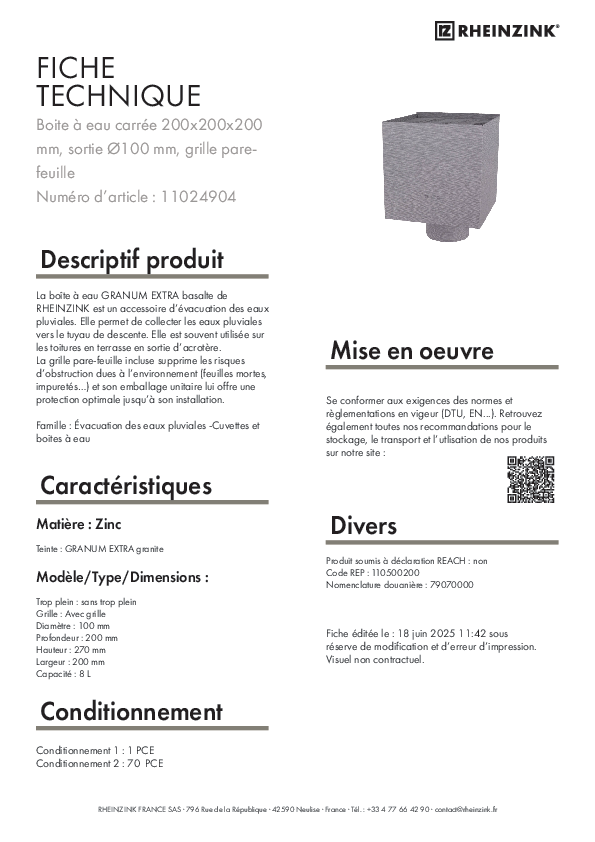 Déclaration de Performance Bobines et feuilles RHEINZINK-CLASSIC, RHEINZINK-prePATINA selon EN 14783