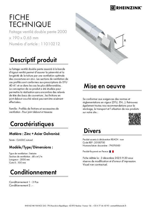 … d’impression. Visuel non contractuel. Conditionnement Conditionnement 1 : 3 Pce Conditionnement 2 : - RHEINZINK FRANCE SAS · 796 Rue de la République · 42590 Neulise · France · Tél. : +33 4 77 66 42 90 ·…