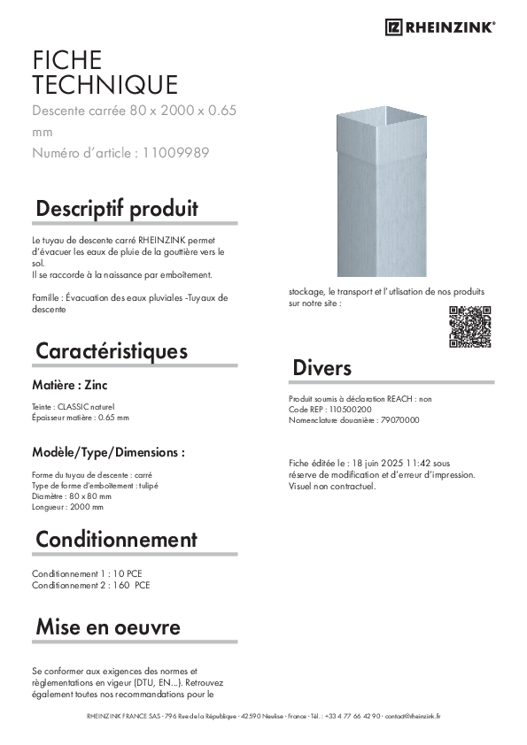 Rechercher sur notre site Type de résultat Général (20) Actualités (1) Télécharger (61) chercher previous12345next Tasseau - Pose et pliage Schémas détaillés et cotés à usage professionnel pdf 9 Mo Bardeaux - Pose et pliage Schémas détaillés et cotés à usage professionnel pdf 9 Mo Le zinc en hiver … de 35 cm. Au niveau de leur raccord, elles seront soudées avec un… Bardage à joint angulaire - Pose et pliage Schémas détaillés et cotés à usage professionnel pdf 11 Mo Catalogue produits et services prePATINA ECO ZINC 2023 Toute la gamme RHEINZINK-prePATINA ECO ZINC pdf 7 Mo Catalogue produits et services 2023 Toute la gamme RHEINZINK pdf 20 Mo Catalogue produits et services GRANUM EXTRA 2025 … ST Profilé d’agrafage UDS pour raccord de couvertines Épaisseur mm … pdf 19 Mo Joint debout - Pose et pliage Schémas détaillés et cotés à usage professionnel pdf 13 Mo Lignes de produit Informations sur le matériau et son utilisation pdf 1 Mo Descente carrée réf. 11009989 Fiche technique de la descente carrée RHEINZINK 11009989 pour l'évacuation des eaux pluviales en zinc pdf 123 Ko previous12345next