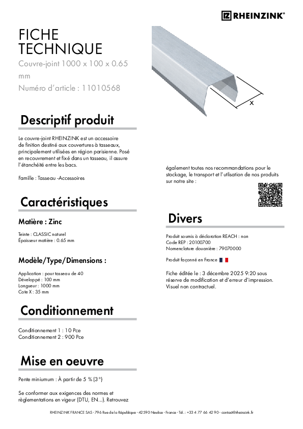 Rechercher sur notre site Type de résultat Général (79) Actualités (14) informations d'identification (48) Télécharger (160) chercher Search words under length of 4 characters are not processed. previous678910next Couvre-joint 1000 x 100 x 0.65 mm - réf. 11010568 Fiche technique du couvre-joint 1000 x 100 x 0.65 mm en zinc CLASSIC naturel - réf. 11010568 pdf 121 Ko Couvre-joint 2000 x 120 x 0.65 mm - réf. 11010579 Fiche technique du couvre-joint 2000 x 120 x 0.65 mm en zinc CLASSIC naturel - réf. 11010579 pdf 120 Ko Couvre-joint 2000 x 166 x 0.65 mm - réf. 11010589 Fiche technique du couvre-joint 2000 x 166 x 0.65 mm en zinc CLASSIC naturel - réf. 11010589 pdf 121 Ko Couvre-joint 2000 x 140 x 0.80 mm - réf. 11010600 Fiche technique du couvre-joint 2000 x 140 x 0.80 mm en zinc CLASSIC naturel - réf. 11010600 pdf 121 Ko Couvre-joint 2000 x 166 x 0.80 mm - réf. 11010603 Fiche technique du couvre-joint 2000 x 166 x 0.80 mm en zinc CLASSIC naturel - réf. 11010603 pdf 121 Ko Façonnage sur-mesure … de chaque bac Fourniture d'un cahier de pose Pour vous éviter la fabrication individuelle… Fiche technique zinc PRISMO … 400 mm pour un poids < 500 kg INSTRUCTIONS DE POSE IMPORTANTES Rayon de pliage Trois fois… pdf 415 Ko Accessoires pour systèmes de couverture …s pour systèmes de couverture de toit RHEINZINK Pour une pose simple, rapide et sûre Outre nos solutions de… Évacuation des eaux pluviales …répondre à différentes exigences. L’une d'elle consiste à poser des systèmes pour évacuer les eaux pluviales. Ces… Chatière AEROSTYLE Chatière plate pour la ventilation des couvertures en ardoise pdf 249 Ko previous678910next