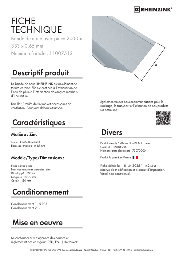 Rechercher sur notre site Type de résultat Général (93) Actualités (20) informations d'identification (14) Télécharger (183) chercher Search words under length of 4 characters are not processed. previous7891011next Découvrez notre nouveau système de ventilation linéaire Plus esthétique, plus pratique et toujours aussi fonctionnel, le nouveau système de ventilation linéaire RHEINZINK s'adapte aux formes les plus courantes de toitures. Découvrez nos nouveaux aspects de surface PRISMO Nous élargissons notre gamme d'aspects de surface pour vous proposer encore plus de liberté pour vos projets. Bande de noue avec pince 2000 x 333 x 0.65 mm réf. : 11007512 … bande de noue avec pince 2000 x 333 x 0.65 mm en zinc RHEINZINK-CLASSIC naturel Numéro d’article :… pdf 1 Mo Natte structurée VAPOZINC PERF Natte structurée avec film hautement perméable à la vapeur d’eau sous Avis Technique n° 5.1/21.2.587_V2_E1 publié le 18/10/24 pdf 202 Ko Cuvette Jambon Ø100 mm réf. 11008136 … pour l'évacuation des eaux pluviales en zinc pdf 151 Ko Cuvette Jambon Ø80 mm réf. 11008134 … pour l'évacuation des eaux pluviales en zinc pdf 150 Ko Cuvette Jambon Ø100 mm réf. 11008140 … pour l'évacuation des eaux pluviales en zinc pdf 150 Ko Cuvette Jambon Ø80 mm réf. 11008130 …Fiche technique de la cuvette de branchement en zinc RHEINZINK-CLASSIC naturel 11008130 pour l'évacuation des eaux… pdf 151 Ko Cuvette Jambon Ø100 mm réf. 11008141 … pour l'évacuation des eaux pluviales en zinc pdf 152 Ko Cuvette Jambon Ø80 mm réf. 11024399 … pour l'évacuation des eaux pluviales en zinc pdf 152 Ko previous7891011next